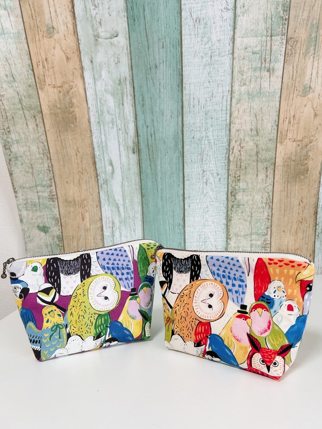 鳥いっぱい♡ 地も色アイボリー、パープルの2種類です。 バッグの中の小物整理に、 サニタリー、コスメポーチ、 大きめペンケース、アレを入れてもいいですね! サイズ 横20cm 縦13cm まち6cm コットン